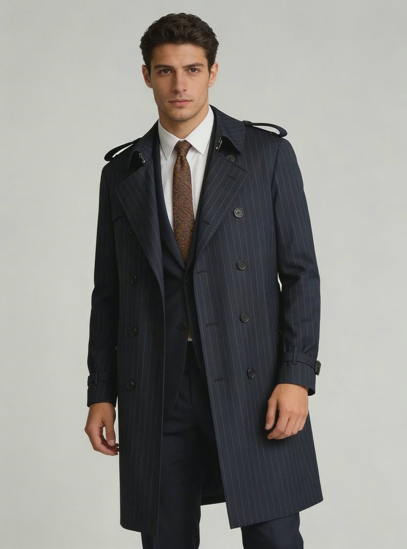 The tailoring emphasizes a clean shoulder line and a structured chest, flowing naturally through the body for a balanced silhouette that feels sharp without appearing rigid. The length is designed to sit below the knee, offering coverage and warmth while maintaining an elegant proportion. The striped wool fabric enhances the vertical line of the coat, contributing to a polished and elongated appearance that works well over suits, sport coats, or tailored separates. This overcoat is intended for professionals who want a statement outer layer that communicates precision and confidence without excess.