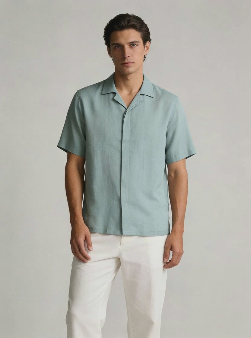 Crafted from 100% European linen, this short sleeve shirt is designed for warm weather comfort with a refined, relaxed structure. The lightweight 115g fabric offers excellent breathability and natural airflow, making it ideal for summer wear, travel, and casual to smart casual settings. The grayish green tone delivers a clean, modern look that remains easy to dress up or down. The soft collar and straight silhouette provide a comfortable fit while maintaining a polished appearance. This shirt pairs well with tailored trousers, chinos, or lightweight summer pants, and can be worn tucked or untucked depending on the occasion.
